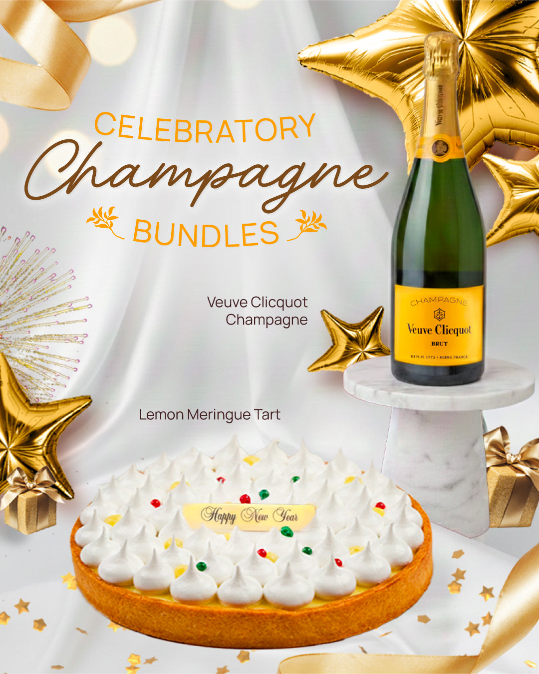 Make your New Year's Eve celebrations extra special with your favourite Lemon Meringue Tart from Caro Patisserie — now paired with a bottle of Veuve Clicquot Brut Champagne for the perfect festive indulgence.