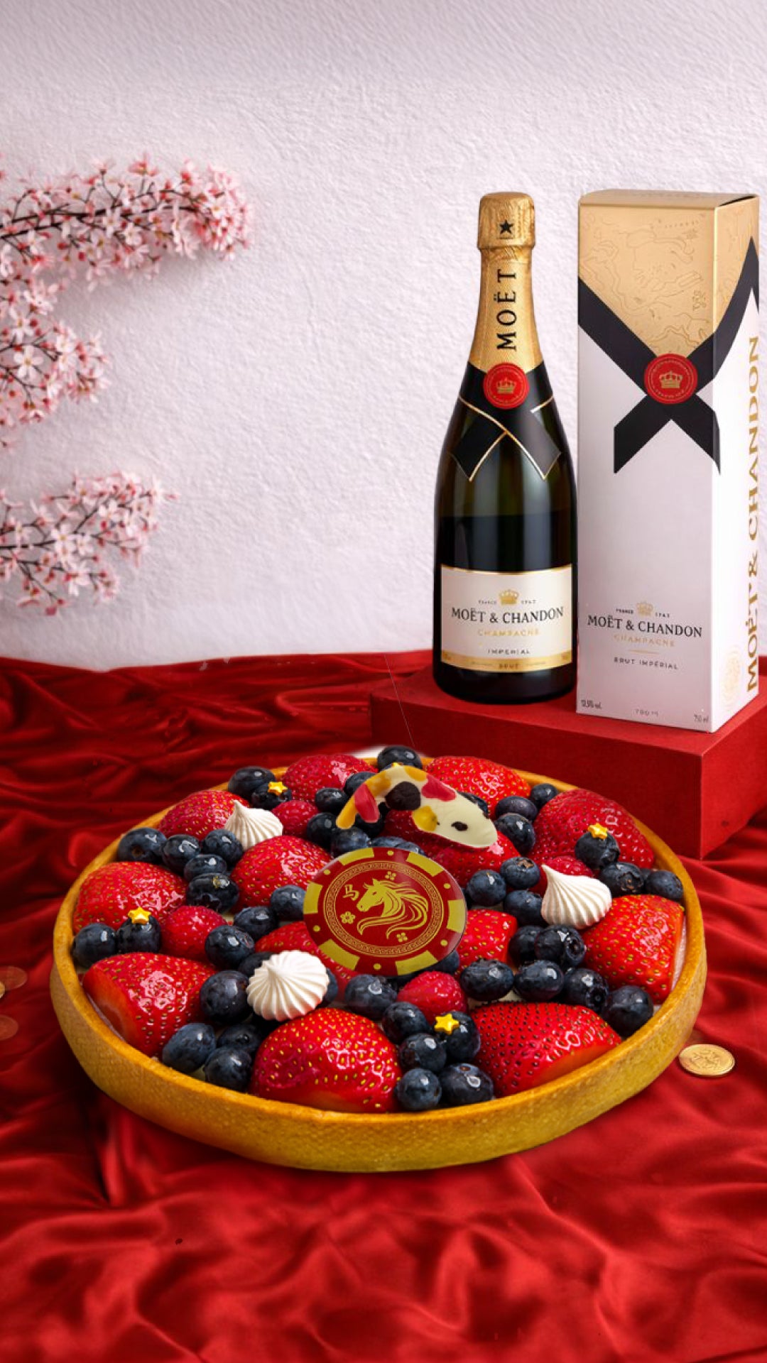 Finished with a Year of the Horse poker chip and a delicate chocolate koi fish, symbolising abundance, perseverance, and prosperity, this elegant tart is perfect for Chinese New Year celebrations and auspicious gifting.