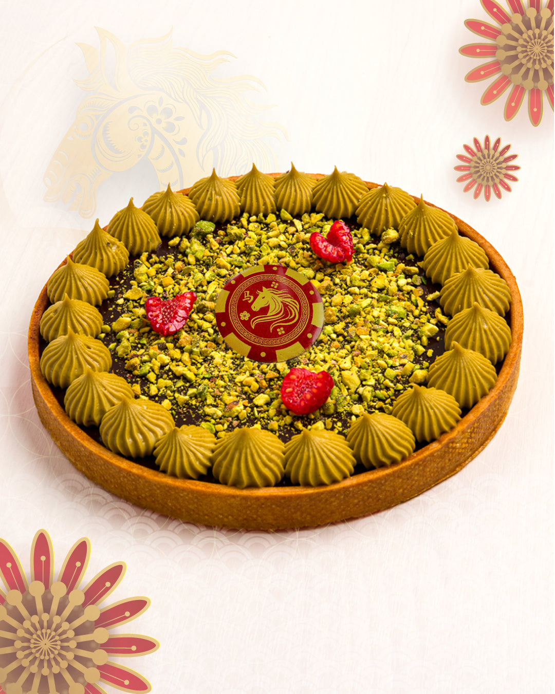 Celebrate the Year of the Horse with our limited-edition Pistachio & Chocolate Tart. A crisp buttery tart shell, filled with rich dark chocolate ganache, generously topped with roasted pistachios and finished with smooth pistachio cream rosettes.