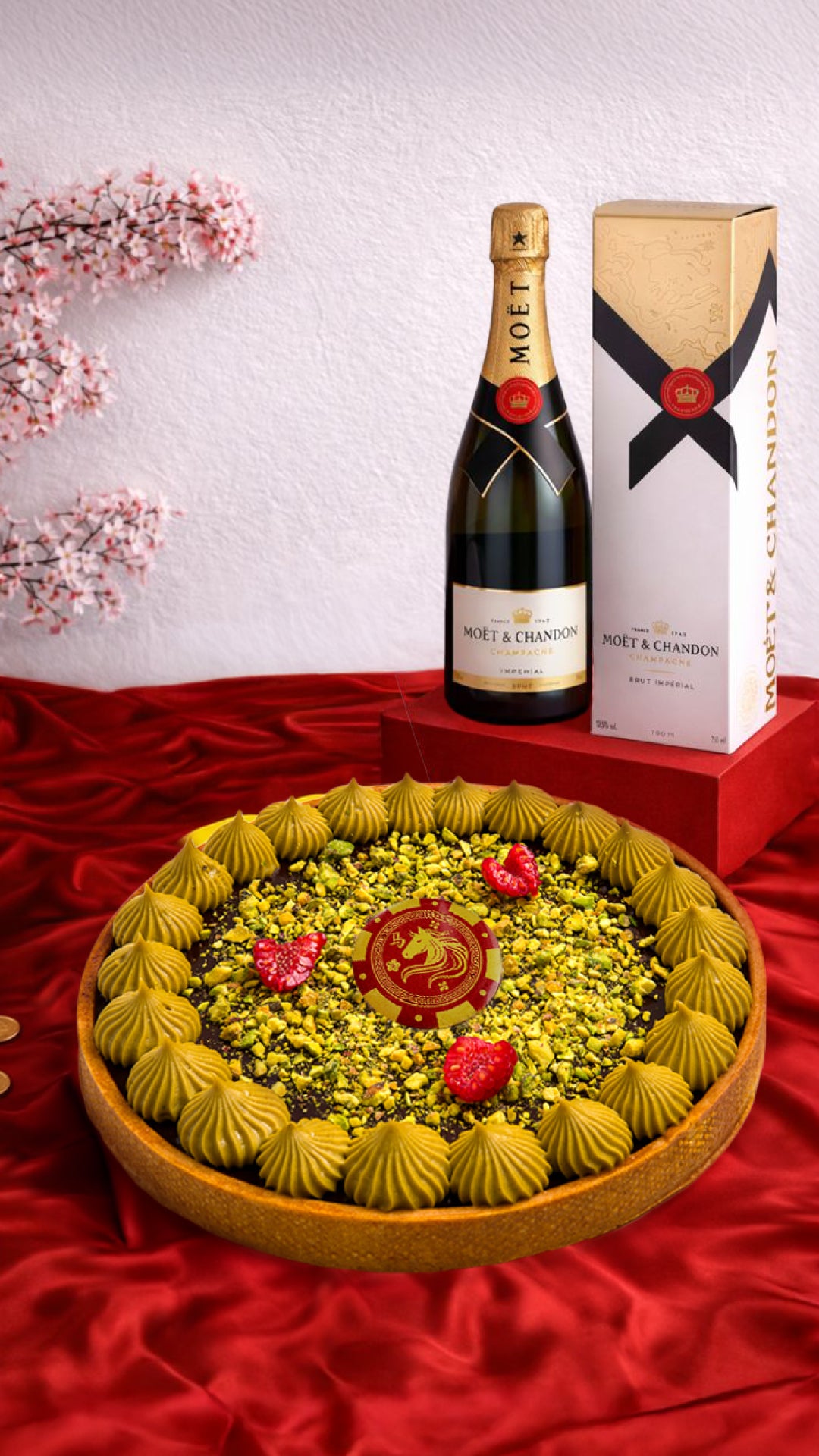 Adorned with a festive Year of the Horse poker chip, this indulgent tart symbolises strength, prosperity, and good fortune — perfect for Chinese New Year gatherings or refined gifting.