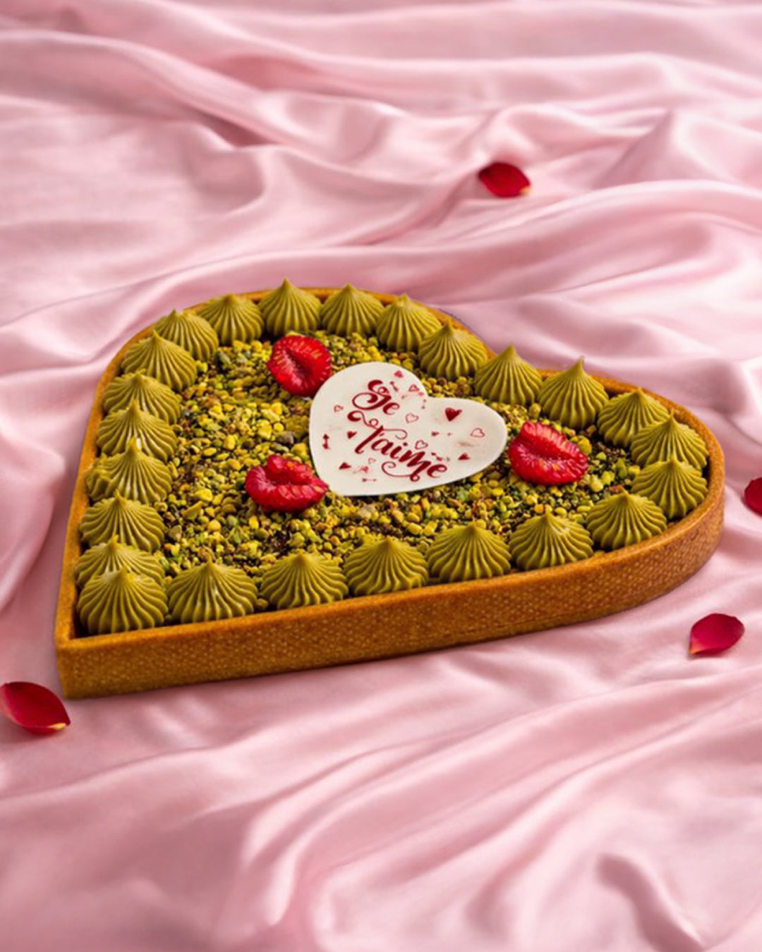 Our Pistachio & Chocolate Heart is a rich yet balanced heart-shaped tart, perfect to show your love on Valentine’s Day. A crisp handmade buttery tart shell is filled with smooth pistachio cream and silky chocolate pastry cream, offering a luxurious combination of nuttiness and deep cocoa notes.